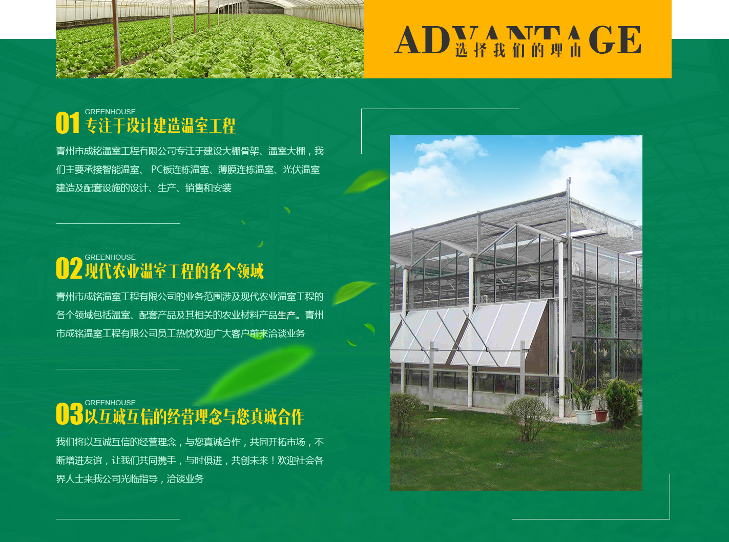 青州市成铭温室工程有限公司专注于建设大棚骨架、温室大棚,我们主要承接智能温室建造、 PC板连栋温室、薄膜连栋温室、光伏温室建造及配套设施的设计、生产、销售和安装,我们的业务范围涉及现代农业工程的各个领域,包括温室、配套产品及其相关的农业材料产品生产。