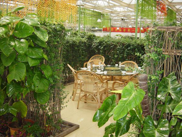 生态温室餐厅是将现代设施农业和餐饮结合的产物,以人为本、餐饮为主、景观为为辅的一种大型温室类建筑,把温室的轻巧、便捷、明朗的特点与建筑的多功能性融为一体,餐厅有充满绿的自然环境,把大自然丰富多彩的生态景观“微缩化”和“艺术化”。它综合运用建筑学、园林学、设施园艺学、生态学等相关学科知识进行规划、设计和建设,以设施调控技术、农艺栽培技术来维护餐厅的优美环境,形成以绿景观植物为主,蔬、果、花、草、药、菌为辅的植物配置格局,结合假山、瀑布、小桥流水、竹木亭阁的园林景观,为就餐者提供优美、舒适、悠闲、宜人的就餐环境,可口的生态(有机)食品,采用节能、节水,残渣、废弃物循环再利用环保措施的可持续运作模式,摆脱了传统意义上的温室只用于种植的局限性,使温室具有餐饮功能、观赏功能、休闲功能、娱乐功能、食品推广功能、节能环保功能等。