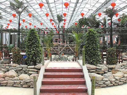 生态温室餐厅是将现代设施农业和餐饮结合的产物,以人为本、餐饮为主、景观为为辅的一种大型温室类建筑,把温室的轻巧、便捷、明朗的特点与建筑的多功能性融为一体,餐厅有充满绿的自然环境,把大自然丰富多彩的生态景观“微缩化”和“艺术化”。它综合运用建筑学、园林学、设施园艺学、生态学等相关学科知识进行规划、设计和建设,以设施调控技术、农艺栽培技术来维护餐厅的优美环境,形成以绿景观植物为主,蔬、果、花、草、药、菌为辅的植物配置格局,结合假山、瀑布、小桥流水、竹木亭阁的园林景观,为就餐者提供优美、舒适、悠闲、宜人的就餐环境,可口的生态(有机)食品,采用节能、节水,残渣、废弃物循环再利用环保措施的可持续运作模式,摆脱了传统意义上的温室只用于种植的局限性,使温室具有餐饮功能、观赏功能、休闲功能、娱乐功能、食品推广功能、节能环保功能等。