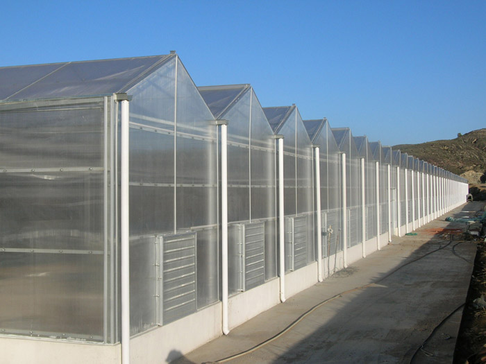 连栋温室是一种经济型温室,它以优美的弧线形和造价低倍受用户欢迎。弧形室顶美观大方,视线流畅。结构用钢量小,保温性能好。制造成本相对较低,属经济型温室,适用于我国大部分地区。北方地区多采用双层膜温室,南方地区多选用单膜温室。能在可见光0.4-0.7微米范围内得到大光照,层膜充气后,可以形成厚厚的气囊,能有效地防止热量流失和阻止冷空气的侵入,采用双层充气膜后可大大提高温室保温性能,节省运行成本。覆盖材料顶部为聚乙烯无滴长寿膜覆盖,外层防紫外线,内层防集露;四周可以根据用户需要采用聚乙烯无滴长寿膜或聚碳酸酯中空板覆盖。
