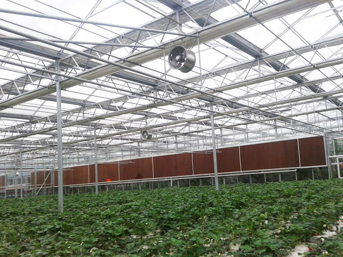 连栋温室是一种经济型温室,它以优美的弧线形和造价低倍受用户欢迎。弧形室顶美观大方,视线流畅。结构用钢量小,保温性能好。制造成本相对较低,属经济型温室,适用于我国大部分地区。北方地区多采用双层膜温室,南方地区多选用单膜温室。能在可见光0.4-0.7微米范围内得到大光照,层膜充气后,可以形成厚厚的气囊,能有效地防止热量流失和阻止冷空气的侵入,采用双层充气膜后可大大提高温室保温性能,节省运行成本。覆盖材料顶部为聚乙烯无滴长寿膜覆盖,外层防紫外线,内层防集露;四周可以根据用户需要采用聚乙烯无滴长寿膜或聚碳酸酯中空板覆盖。